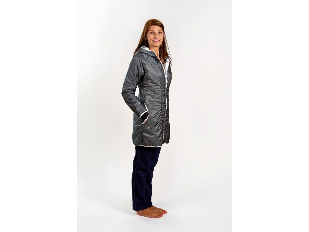 Dámský zateplený kabát OSLO módního střihu s kapucí má praktickou prodlouženou délku. Bunda je na zip otevíratelný i zespoda, rukávy jsou ukončené gumičkou a vnitřní elastickou manžetou, na bocích jsou kapsy.